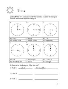 Students tell time. In this ELL vocabulary development and math lesson, students orally tell time to five minute intervals when shown a classroom clock. Students practice using number and "telling time" vocabulary in sentences and...