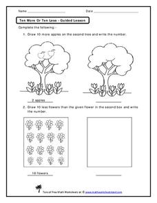This set of problems has learners complete a variety of tasks as they practice adding 10 and subtracting 10. An apple tree with two apples isn't very fun; how about one with ten more? They draw the apples onto the tree and write the...