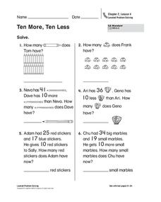 The eight problems on this worksheet ask first graders to match the star that contains a number that is ten more or ten less than the given number. Caution: Some learners might be confused by the formatting of the prompts.