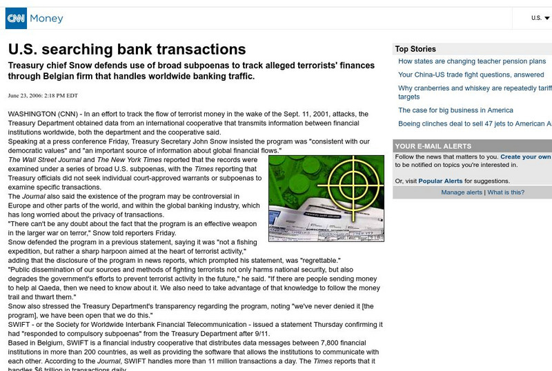 Presents data on how the United States Treasury is using an international financial telecommunications company to find where terrorist groups are keeping their money. (June 2006)