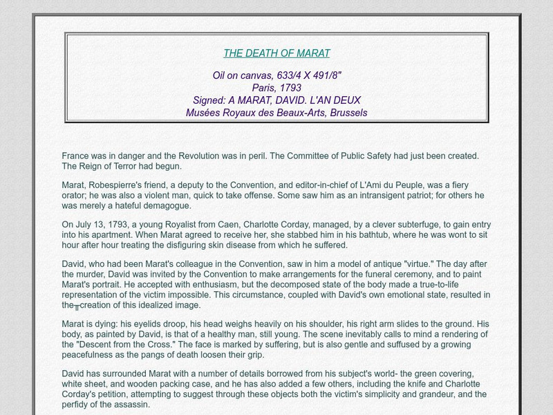 This resource from the CGFA provides a short essay on the history and description of the painting "The Death of Marat" by Jacques-Louis David. Includes a pen and ink study of Marat's head and a link to view the painting "Death of Marat".