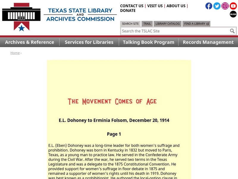 Texas State Library and Archives Commission: The Movement Comes of Age: e.l. Dohoney to Erminia Folsom, Dec 20, 1914