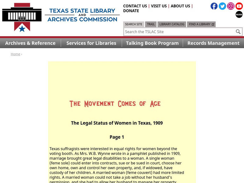 Texas State Library and Archives Commission: The Movement Comes of Age: The Legal Staus of Women in Texas, 1909