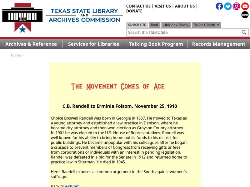 Texas State Library and Archives Commission: The Movement Comes of Age: c.b. Randell to Erminia Folsom, 1910