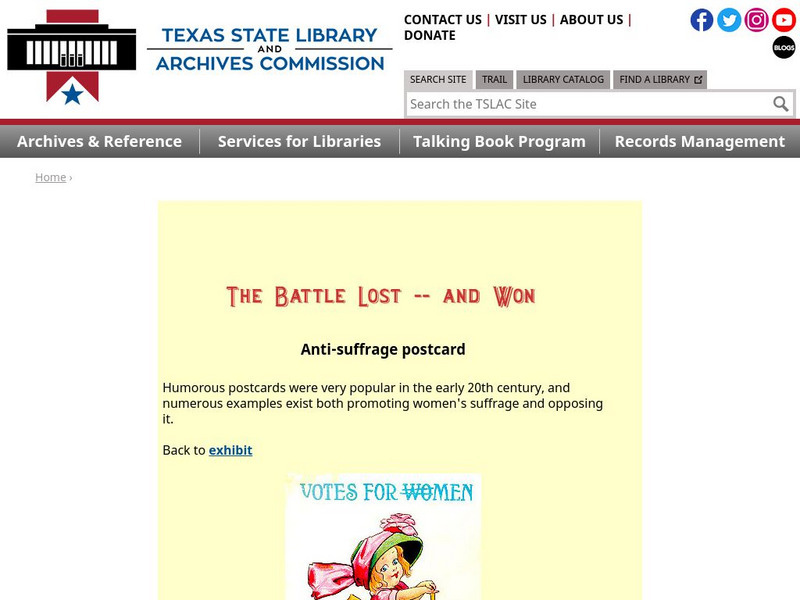 Texas State Library and Archives Commission: The Battle Lost and Won: Anti Suffrage Postcard