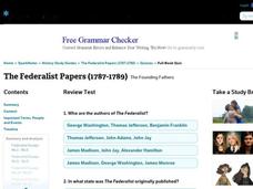 An online interactive history quiz awaits your eager upper graders. They respond to 50 multiple choice questions about the Federalist Papers, and then submit their answers to be scored. While the quiz covers some pertinent...