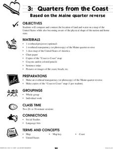 Students examine the Maine state quarter and discuss the features on the quarter that identify Maine as a coastal state. They identify coastal states and inland states on a map.