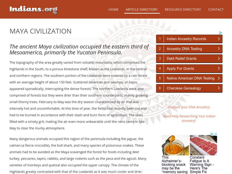 This site describes the geography and landscape of the areas once inhabited by the Mayas. There is also information on Mayan writing, literature, culture, political organization, Mayan art, and other information on the Mayan Civilization.
