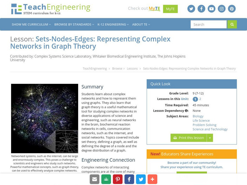 Students learn about complex networks and how to represent them using graphs. They also learn that graph theory is a useful mathematical tool for studying complex networks in diverse applications of science and engineering, such as...