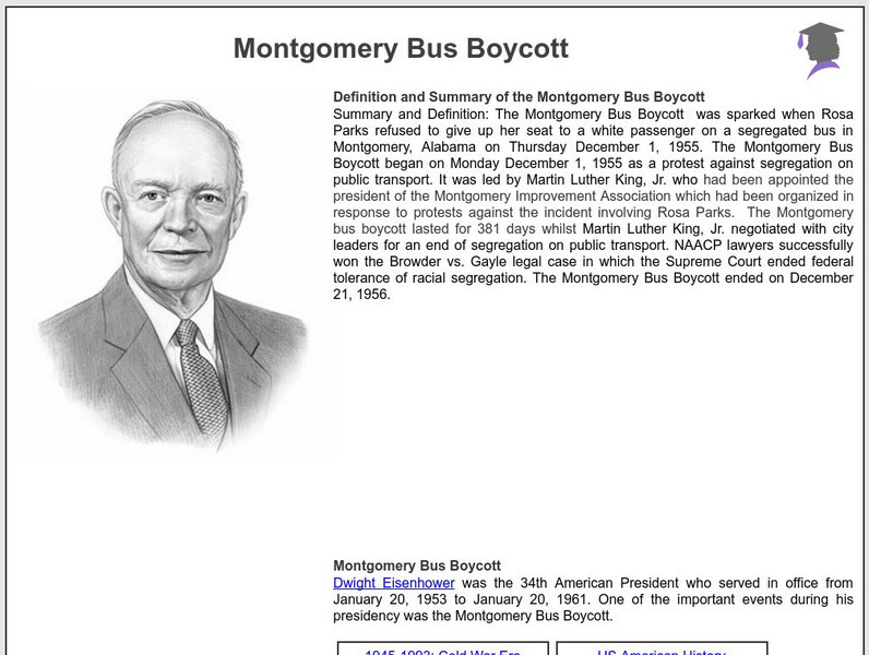 Provides detailed facts and a summary of the Montgomery Bus Boycott, a protest against segregation on public buses that began on December 1, 1955. It was led by Martin Luther King, Jr.