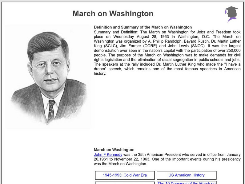 The March on Washington for Jobs and Freedom took place on August 28, 1963, with the purpose of making demands for civil rights legislation and the elimination of racial segregation in public schools and jobs.