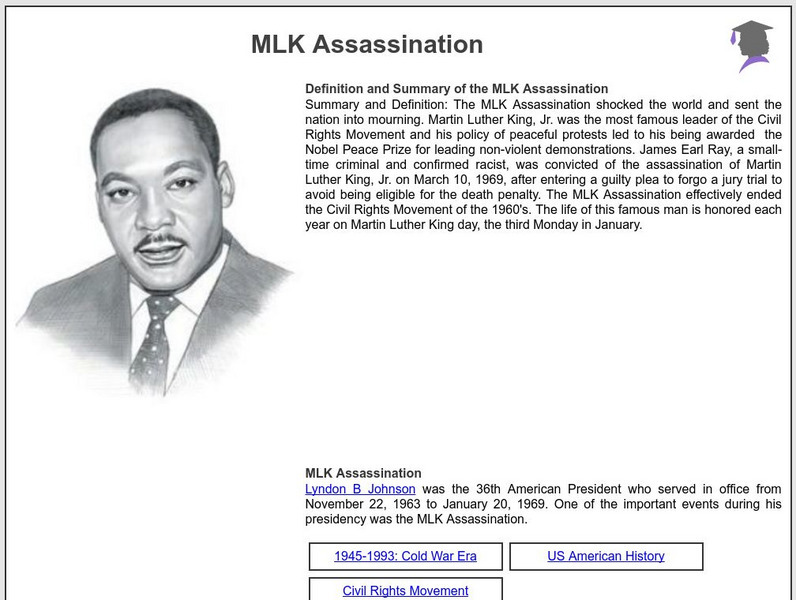 Features detailed facts and a summary of the assassination of Civil Rights activist Martin Luther King, Jr. on April 4, 1968, by James Earl Ray.