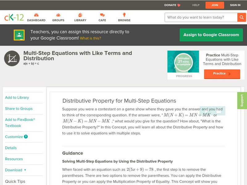 Ck 12: Algebra: Distributive Property for Multi Step Equations