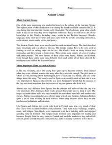 In this Ancient Greece worksheet, students read a 3 page article on Ancient Greece, answer 3 facts about Ancient Greek with multiple choice answers, answer 4 statements as true or false and answer 4 fill in the blank facts about Ancient...