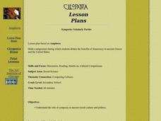 Students hold a symposium during which students debate the benefits of democracy in ancient Greece and the United States. By doing this, students explain the role of symposia in ancient Greek culture and politics.