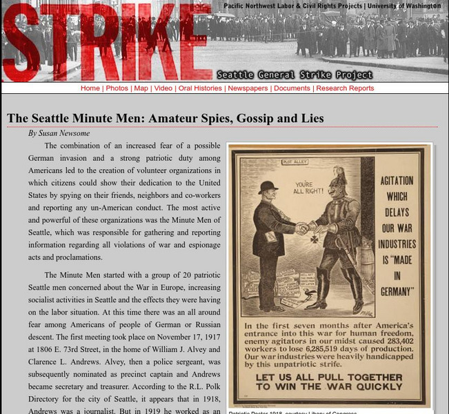 An article detailing the activities of the Minute Men of Seattle, a volunteer organization whose objective was to rout out any enemy of the United States during World War I.