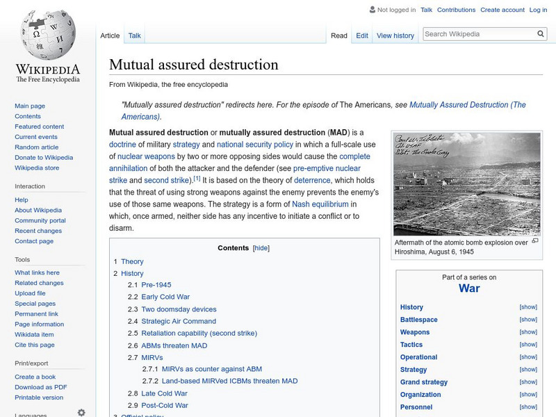 A complete description of the concept of Mutual Assured Destruction. Explains what the concept means, and how the concept was used during the Cold War and up to the George W. Bush Administration. Includes links to terms that may require...