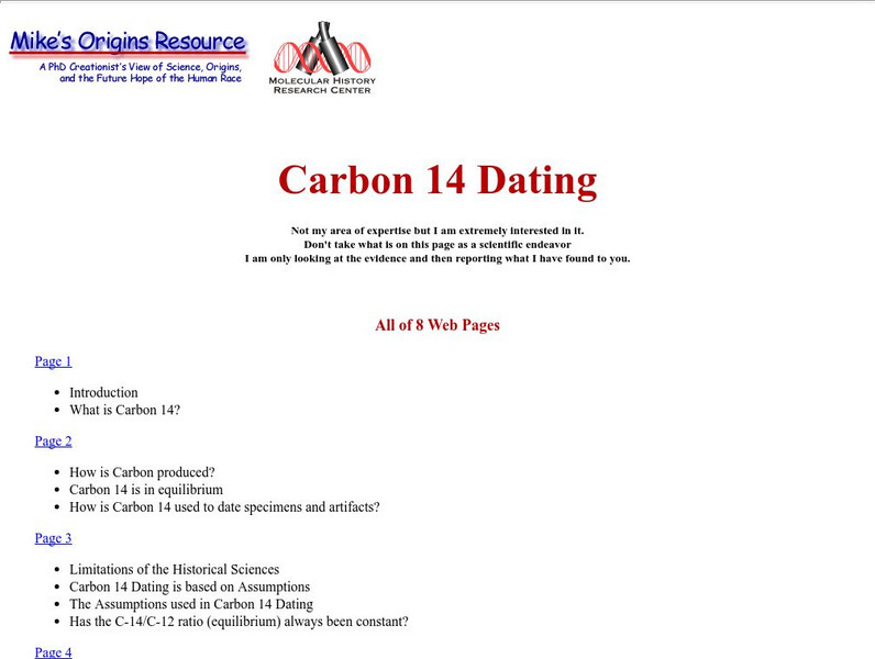 Seven pages all about Carbon 14 Dating. Information on half-life, Carbon 14 used to date specimens and artifacts, limitations, charts and graphs. Michael E. Brown Ph.D. contests that the limitations of Carbon 14 dating support the theory...