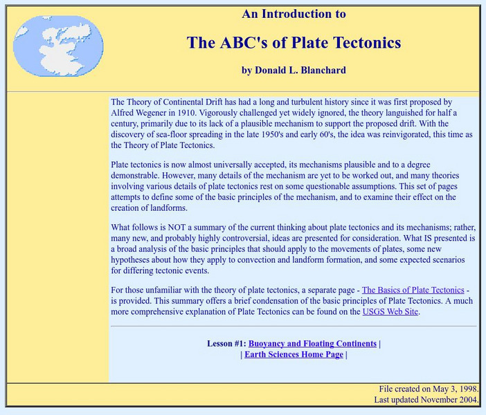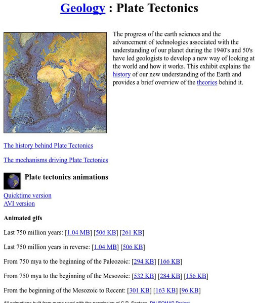 Provides hyperlinks to the history behind and the mechanisms driving plate tectonics. Be sure to click on the globe icons for animations of plate tectonics.