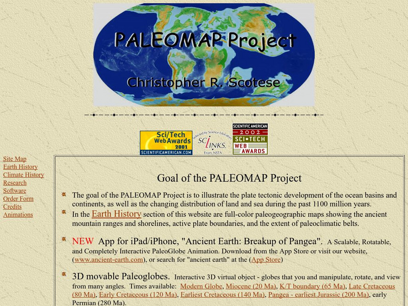 The PALEOMAP Project illustrates the plate tectonic development of the ocean basins and continents, as well as the changing distribution of land and sea during the past 1100 million years. Includes virtual 3D paeloglobes.