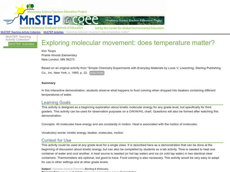 In this interactive demonstration, students observe what happens to food coloring when dropped into beakers containing different temperatures of water.