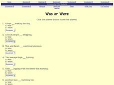 In this was/were worksheet, students fill in blanks in sentences with either was or were. Students may click on an answer button beneath each sentence to check their work.