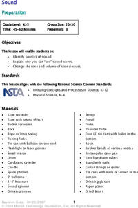 Students identify sources and importance of sound, discuss sounds heard on way to school, explain why sound waves can be "seen", and participate in various classroom activities and experiments that illustrate how sound travels.