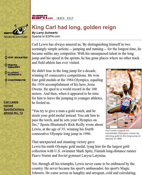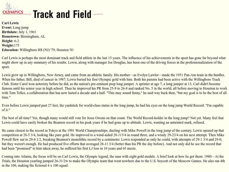 This site discusses the life and career of legendary track & field Olympian Carl Lewis. It offers several links to other informative sites and includes a great picture.