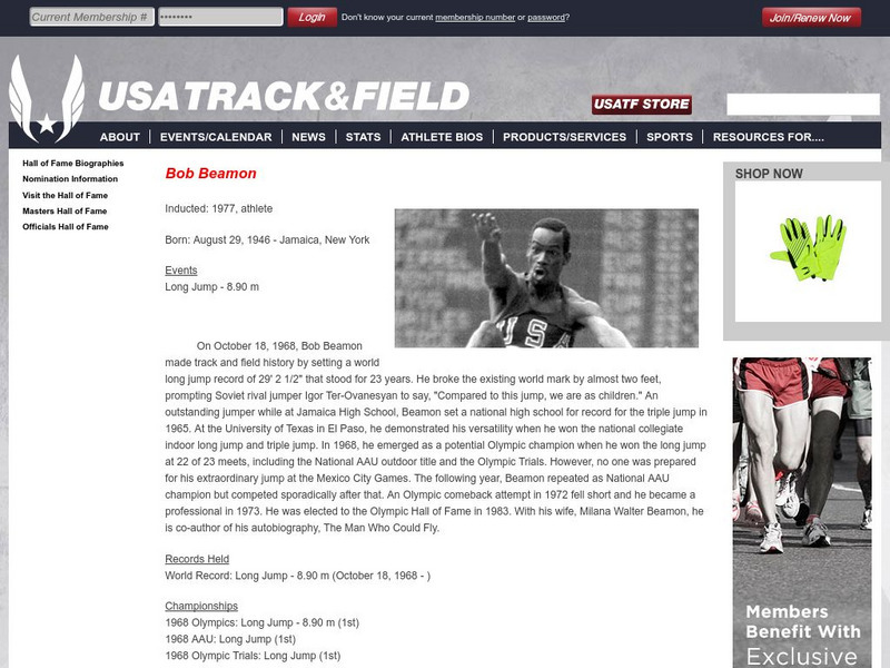 This site offers a brief summary of the accomplishments of Bob Beamon. Also listed are statistics on the records held and championships won by Beamon.