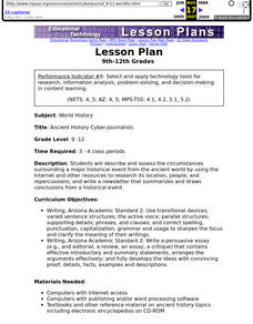 High schoolers describe and assess circumstances surrounding a major historical event from the ancient world by using Internet (and other) resources to research its location, people, and repercussions, & write a newsletter that...