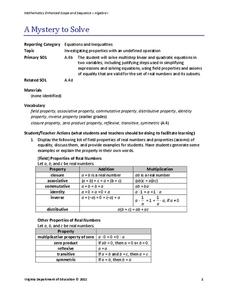 Ninth graders solve linear equations. In this Algebra I lesson, 9th graders investigate the properties of equations (Reflexive, Symmetric, Transitive, Substitution, and Transformation Properties) and use these properties to solve...