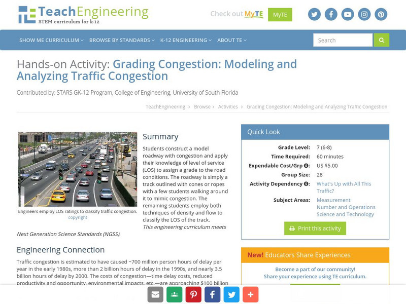 Students construct a model roadway with congestion and apply their knowledge of level of service (LOS) to assign a grade to the road conditions. The roadway is simply a track outlined with cones or ropes with a few students walking...