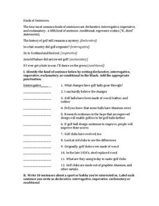 For this sentence structure worksheet, students respond to 22 short answer questions that require them to write and identify sentences as declarative, interrogative, imperative, or exclamatory.