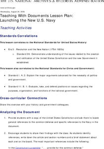 Learners analyze United States Constitution, locate general references to common defense, and specific references in document to U.S. Navy. Students then respond to questions on Document Analysis Worksheet, and discuss relationship...