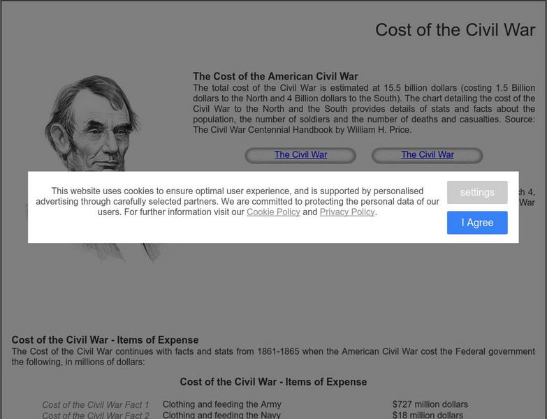 Discussion of the cost of the Civil War which is estimated at 15.5 billion dollars. Provides a chart detailing the cost to the North and the South with statistics and facts about the population, the number of soldiers, and the number of...