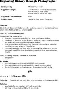 Fifth graders compare and contrast photographs from the 1800s to those of 2003. In groups, they create drawings of how society has changed over time and use maps to locate local streets. Individually, they practice measuring the...