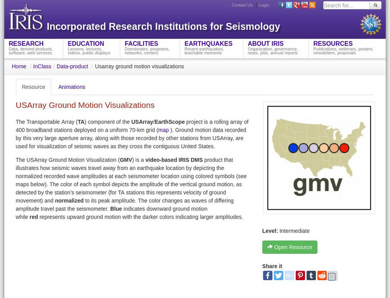 The USArray Ground Motion Visualization (GMV) is a video-based IRIS DMS product that illustrates how seismic waves travel away from an earthquake location by depicting the normalized recorded wave amplitudes at each seismometer location...
