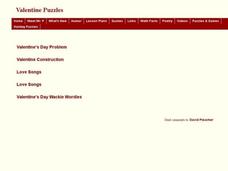 In this algebra worksheet, students solve a valentine puzzle using given clues. They complete 3 puzzles dealing with Valentines day. There is an answer key.