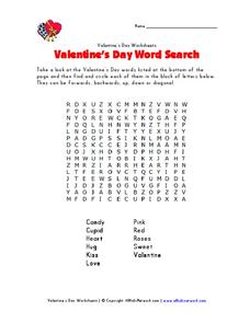 In this Valentine worksheet, students analyze 8 words in a word bank that pertain to Valentine's Day. Students find these words in a word search.