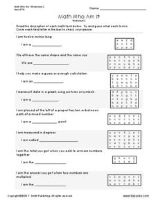 In this math vocabulary worksheet, students read each description of a math term and write the word on the blank line. They circle every third letter in each letter box next to the clue to check their answer. They complete 8 definitions.