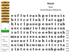 In this music worksheet, students locate 54 words having to do with music. Terms include names of instruments as well as music vocabulary.
