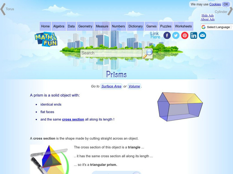 Students learn about the properties of a prism, some different types, and the formulas for surface area and volume. Includes an interactive prism and multiple-choice questions.