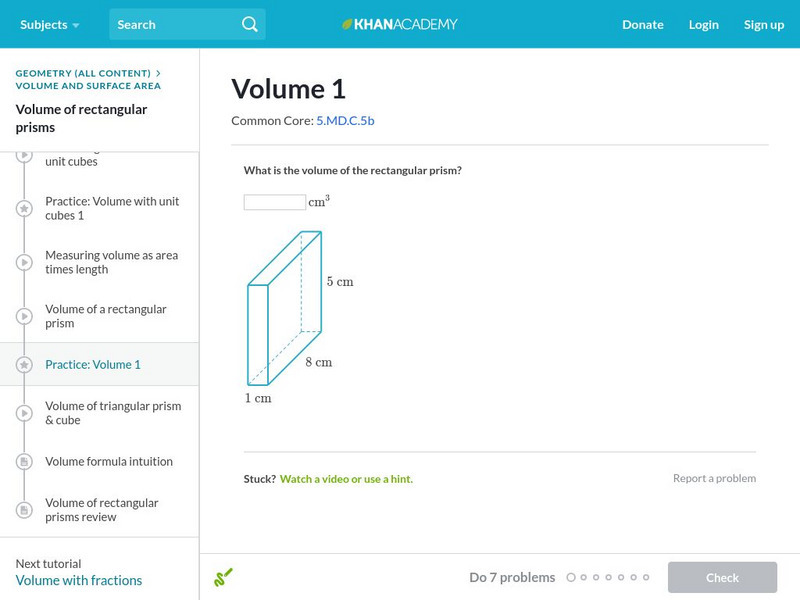 In this exercise, students practice finding volume. Students receive immediate feedback and have the opportunity to get hints and try questions repeatedly.