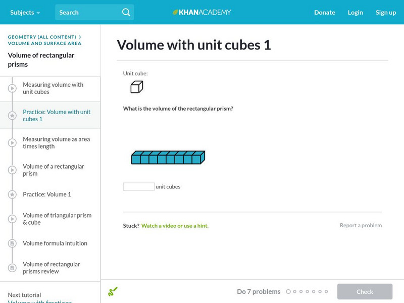 In this exercise, students practice figuring volume with unit cubes. Students receive immediate feedback and have the opportunity to get hints and try questions repeatedly.