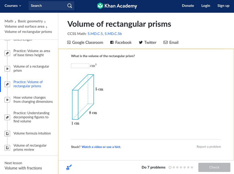 Students attempt practice problems regarding volume of rectangular prisms. Students are attempting to get five consecutive questions correct. Questions include finding the volume of a rectangular prism and finding a missing side length...