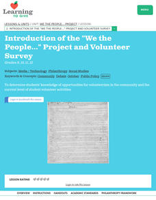 Learners research the kind of volunteer options for teens in their area. They estimate the number of teens who do volunteer by conducting a simple survey. Students display findings in a paper and in charts.