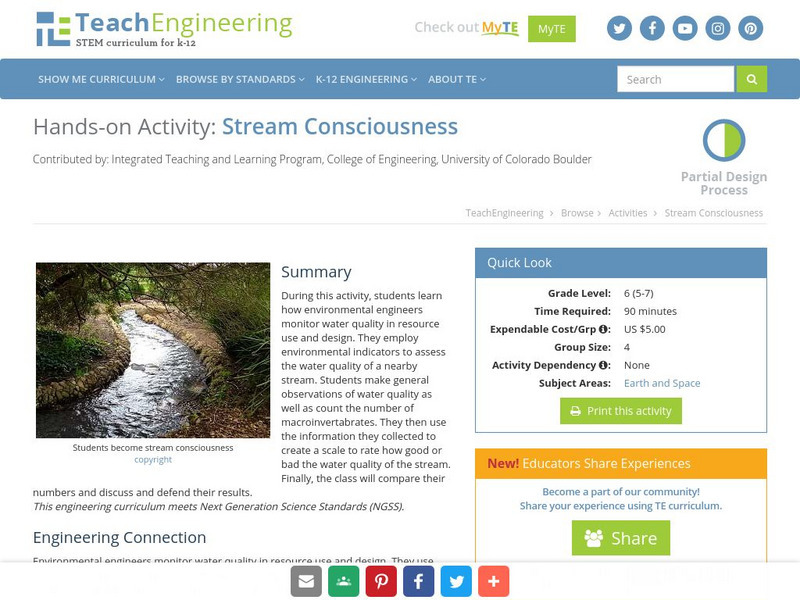 During this activity, students will learn how environmental engineers monitor water quality in resource use and design. They will employ environmental indicators to assess the water quality of a nearby stream. Students will make general...