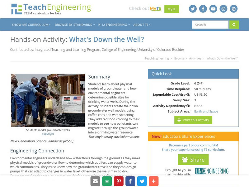 This activity looks at physical models of groundwater and how environmental engineers determine possible sites for drinking water wells. During this activity, students will create their own groundwater well model using a coffee can and...