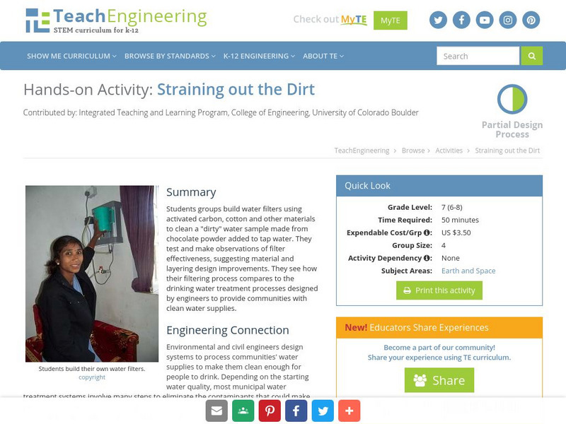 In this activity, students build a water filter with activated carbon, cotton and other materials to remove chocolate powder from water.