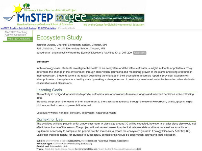Studets investigate the health of an ecosystem and the effects of water, sunlight, nutrients or pollutants. They determine the change in the environment through observation, journaling, and measuring growth of the plants and living...